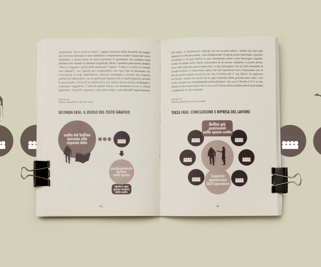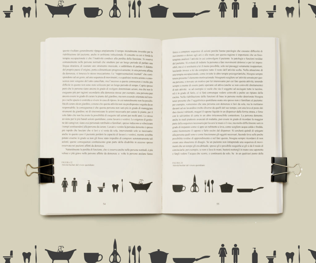 The outcome of this project, is a booklet for caregivers who work in the daily facilities for people who suffer from Alzheimer. Memory Training, is self-explanatory: it’s a game, a memory game. The caregiver will play the game with the patient associating a sticker with a real object in the room, just to help remember their function through simple images.